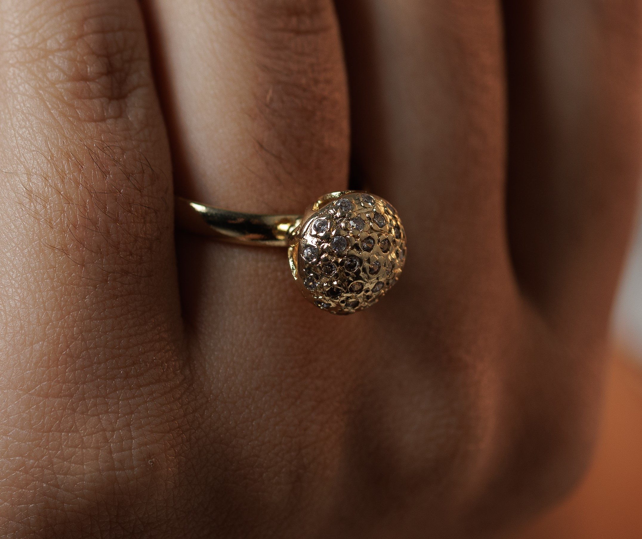 O anel da imagem é de cor dourada, com um design sofisticado e elegante. Ele possui uma base lisa e polida, enquanto a parte superior apresenta uma esfera cravejada de pequenas pedras de zircônia proporcionando um efeito de brilho destacado.
