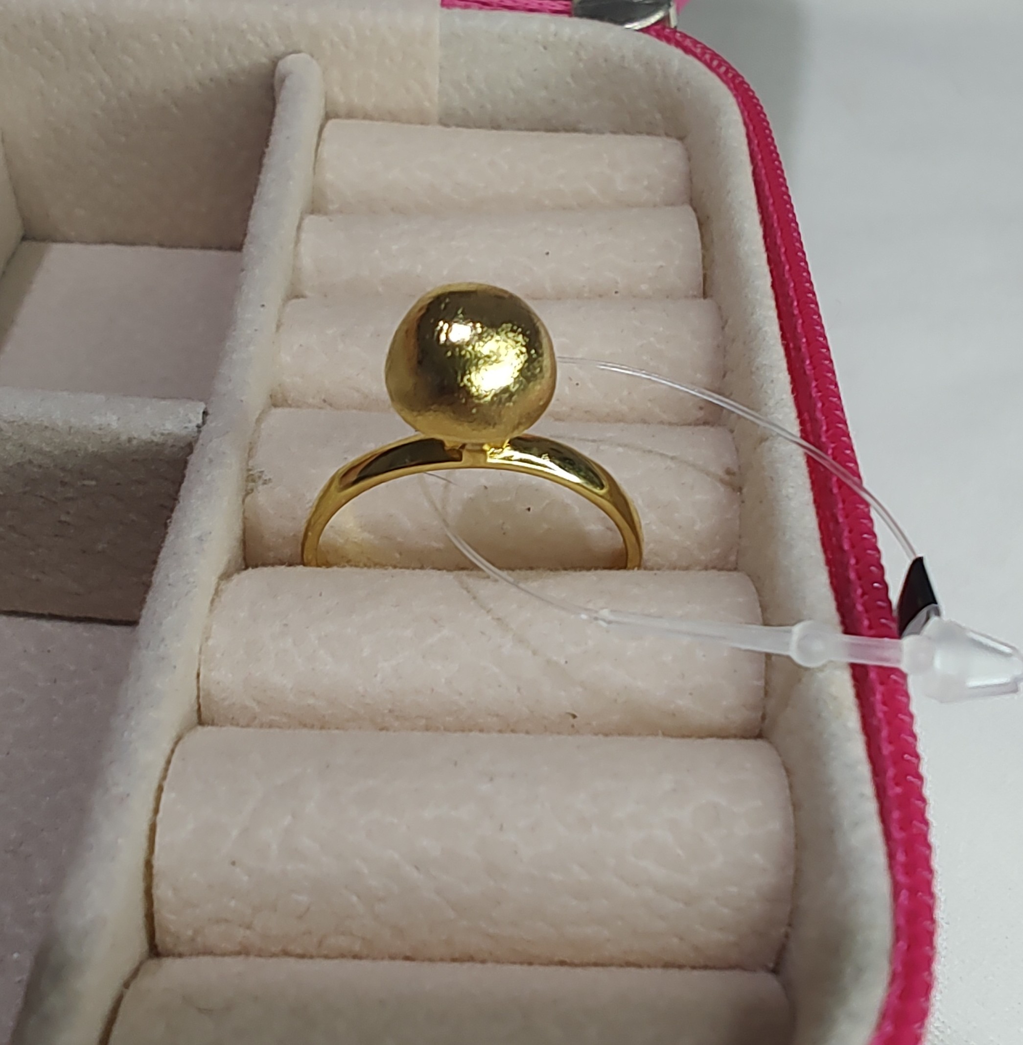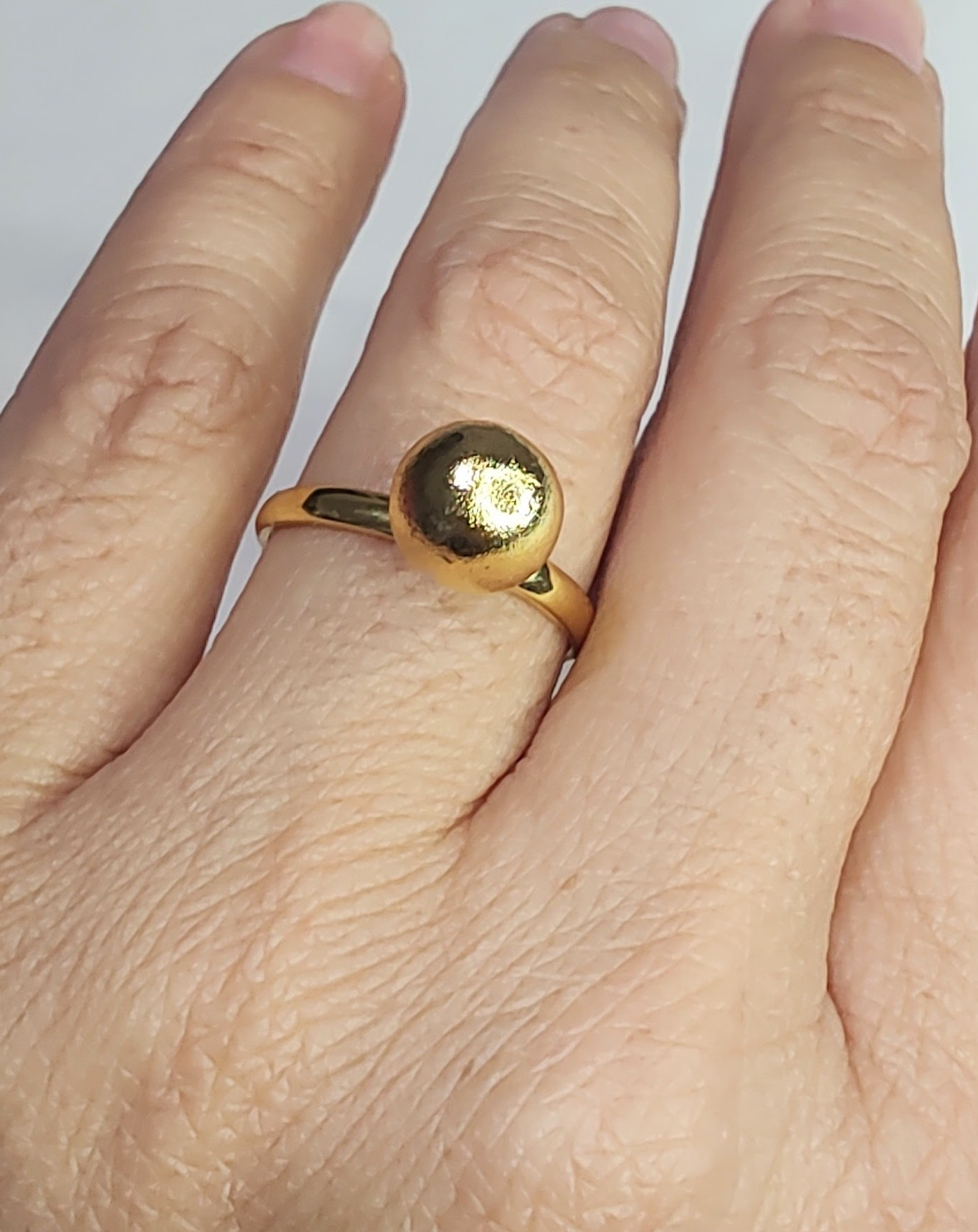 Anel banhado a ouro 18K com esfera lisa e polida em destaque. O design minimalista e contemporâneo valoriza a forma geométrica da bola central, trazendo um visual moderno e elegante. Uma peça versátil que complementa desde produções casuais até composições mais sofisticadas.
