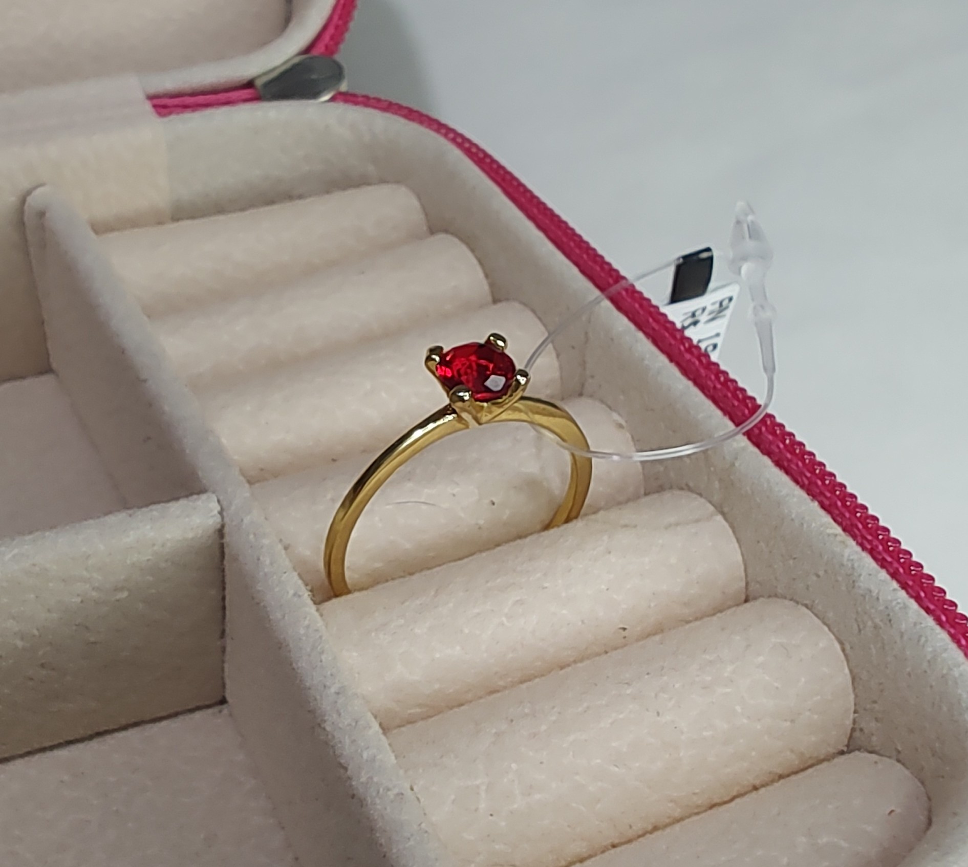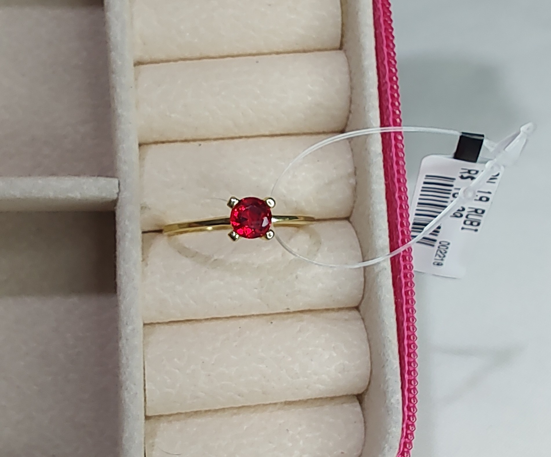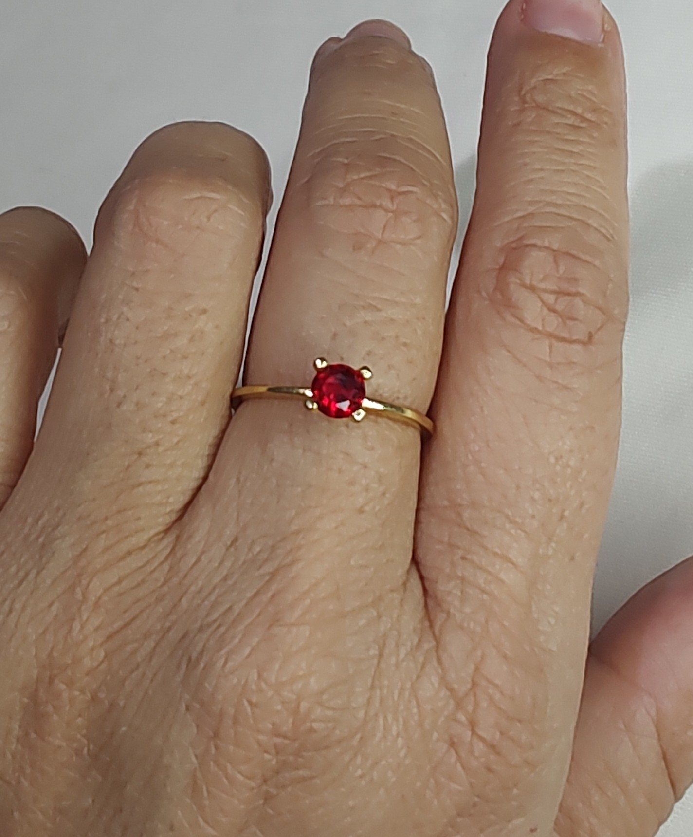 Anel solitário banhado a ouro 18K com pedra central na cor rubi. Seu aro fino realça a imponência da cravação clássica de quatro garras, que valoriza o brilho intenso da pedra vermelha. Uma peça marcante e sofisticada, ideal para quem busca um toque de cor com elegância atemporal.