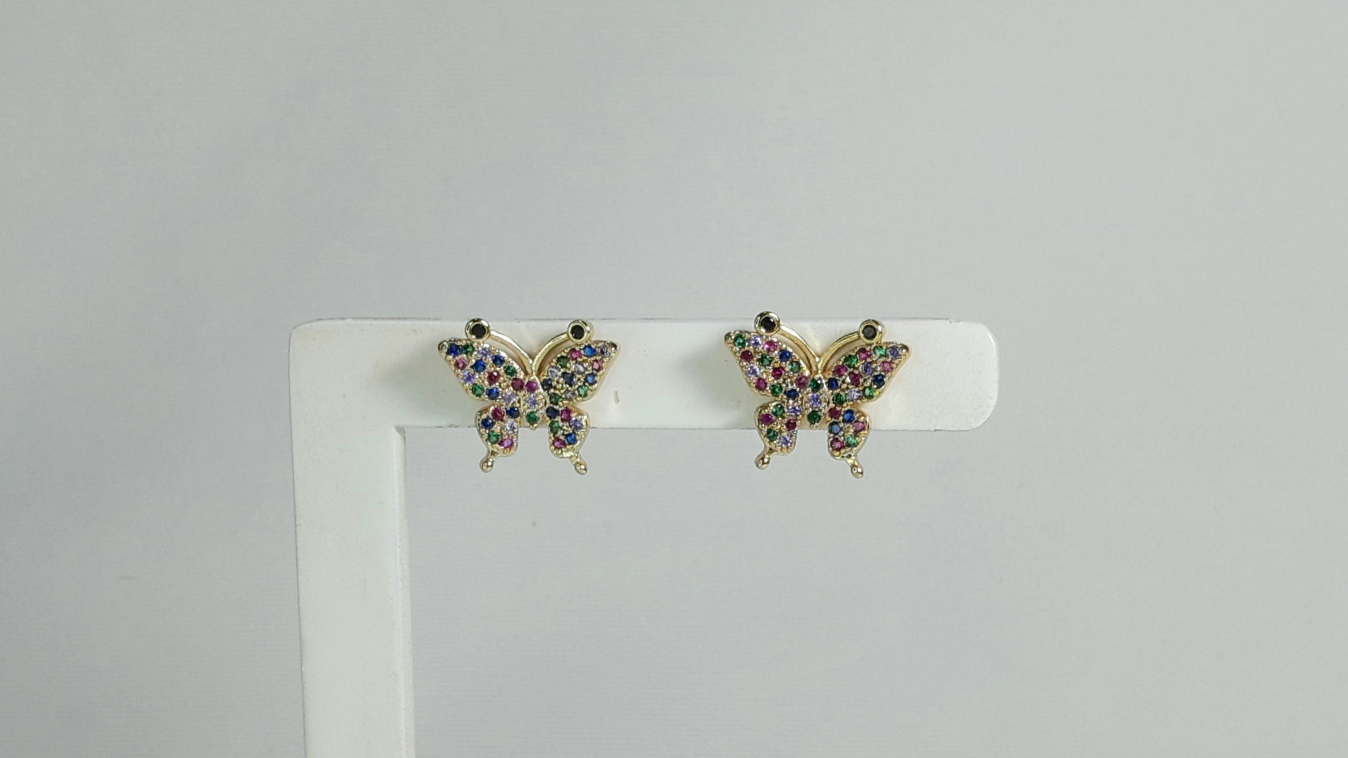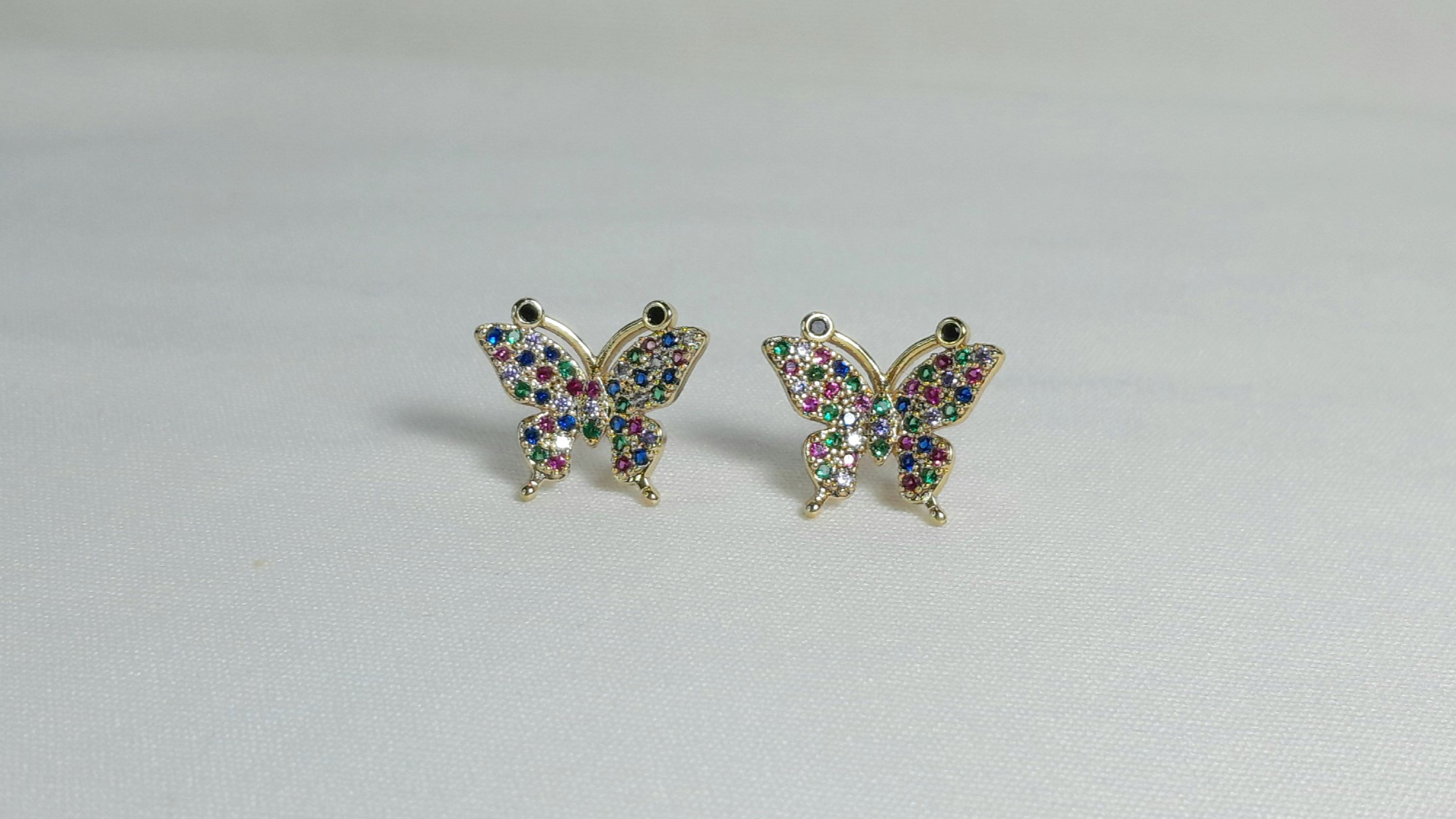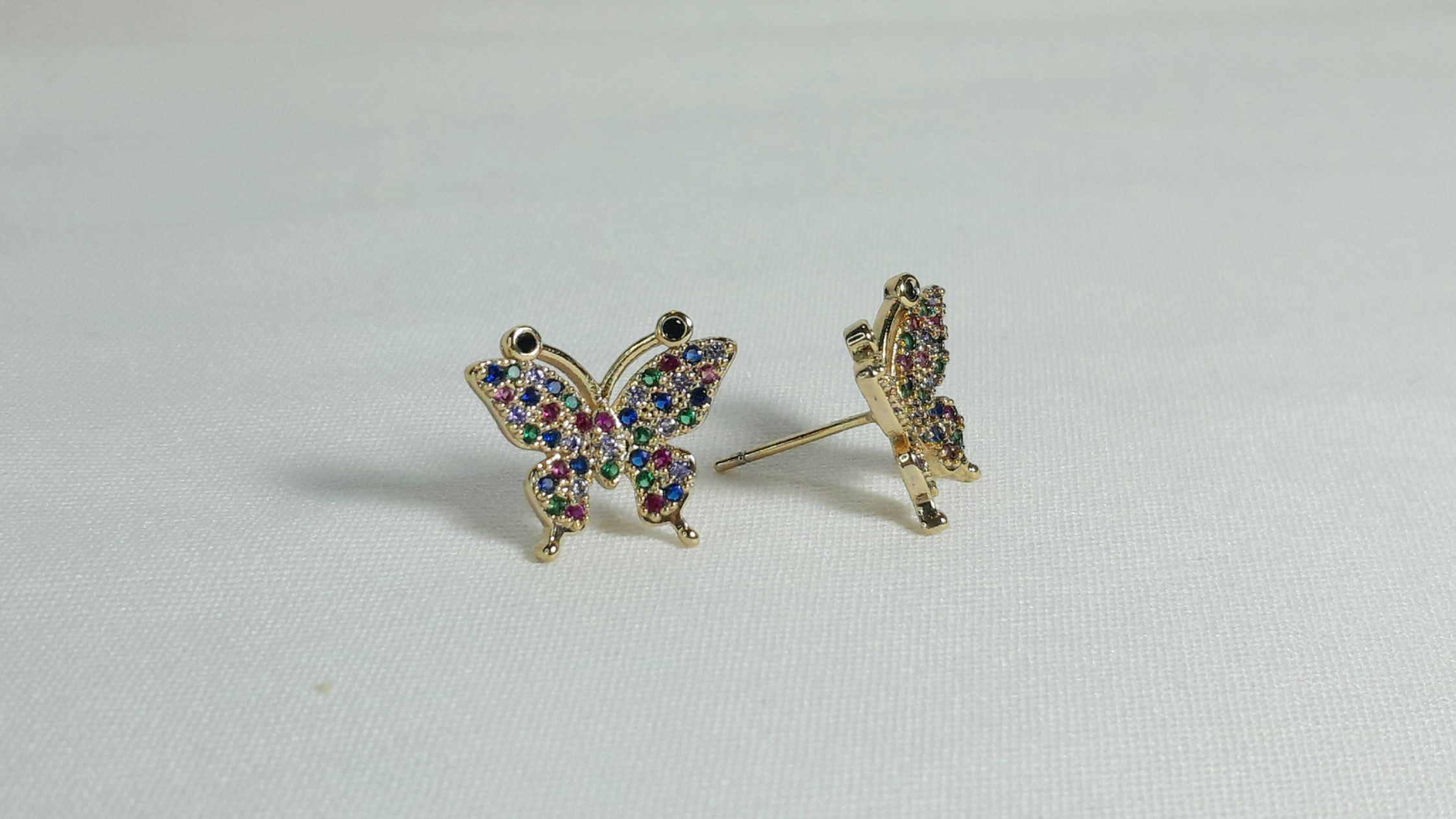 O brinco apresentado nesta imagem é um modelo inspirado em borboleta cravejadas em zircônias coloridas, confeccionado no banho em ouro 18k com acabamento altamente polido e brilhante. A peça possui formato de uma borboleta Rabo de Andorinha Azul , conferindo um visual cheio de personalidade e graça. A peça é destacada por sua beleza delicada e sutil, trazendo graciocidade e glamour pro dia a dia.
