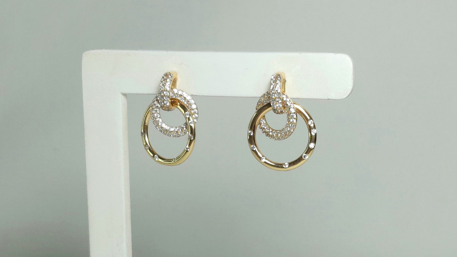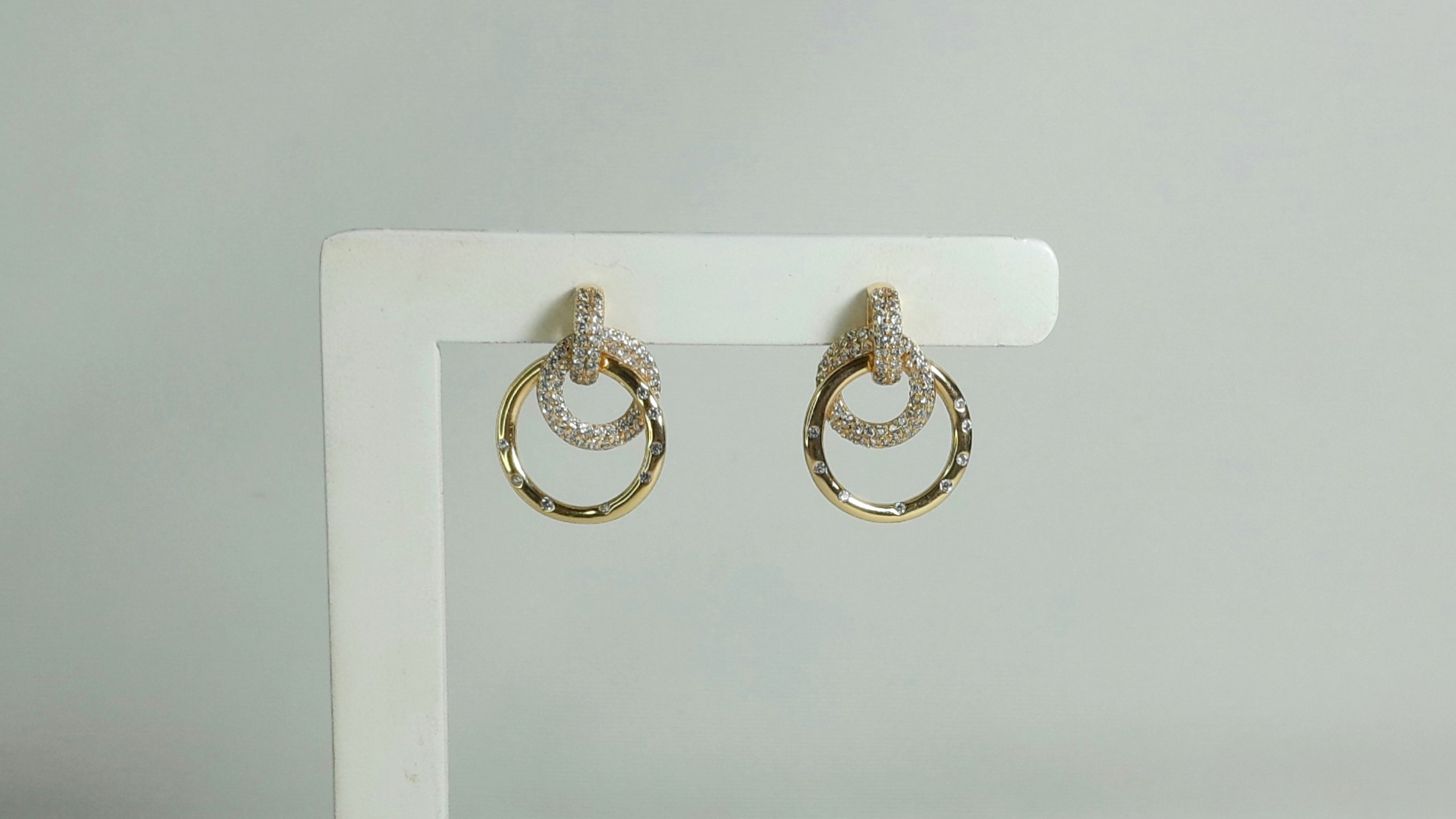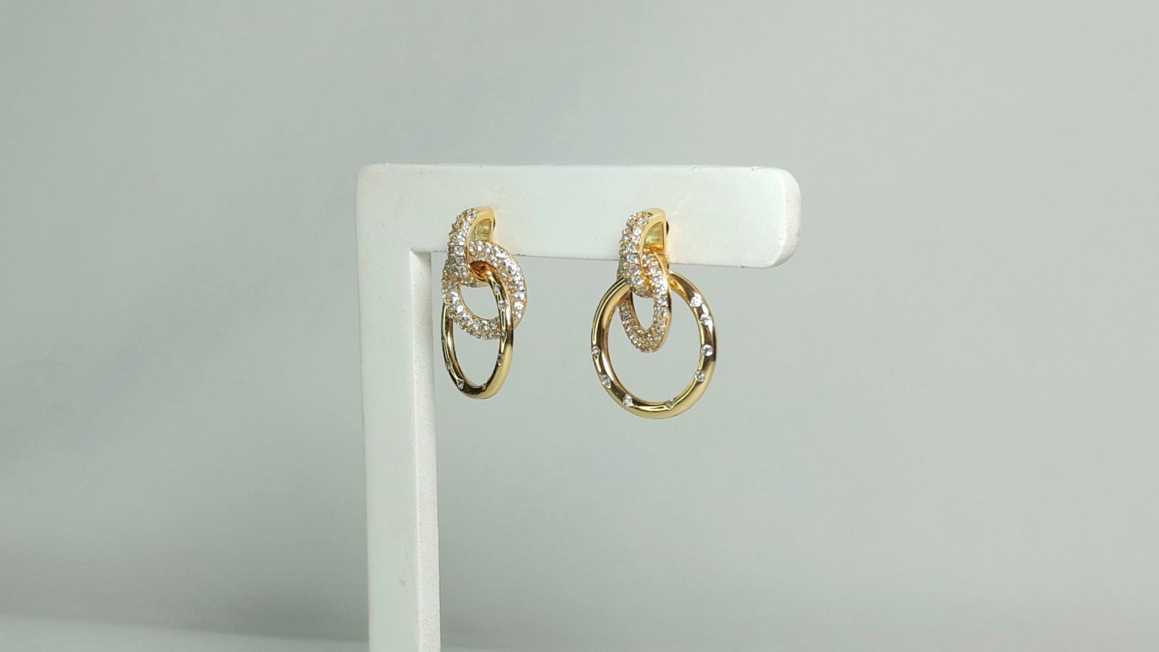 Este brinco sofisticado é composto por dois aros interligados, sendo um com acabamento dourado polido e o outro cravejado com pequenas pedras brilhantes, que adicionam um toque de glamour. A base também é adornada com as mesmas pedras, formando um nó decorativo elegante. Com design moderno e refinado, este acessório é ideal para ocasiões especiais, complementando visuais elegantes e chamativos.