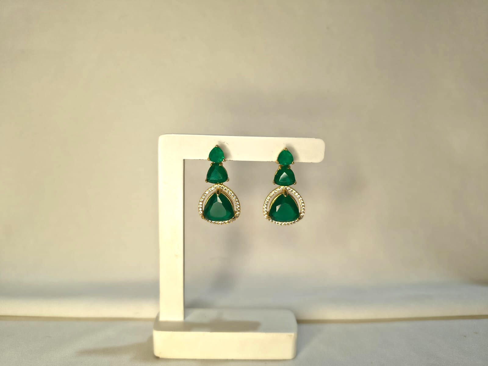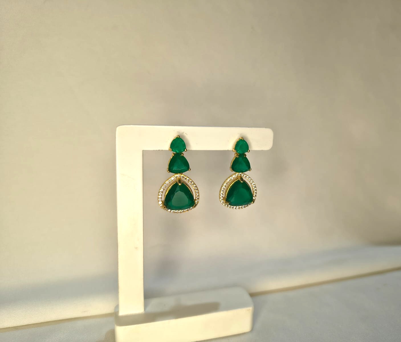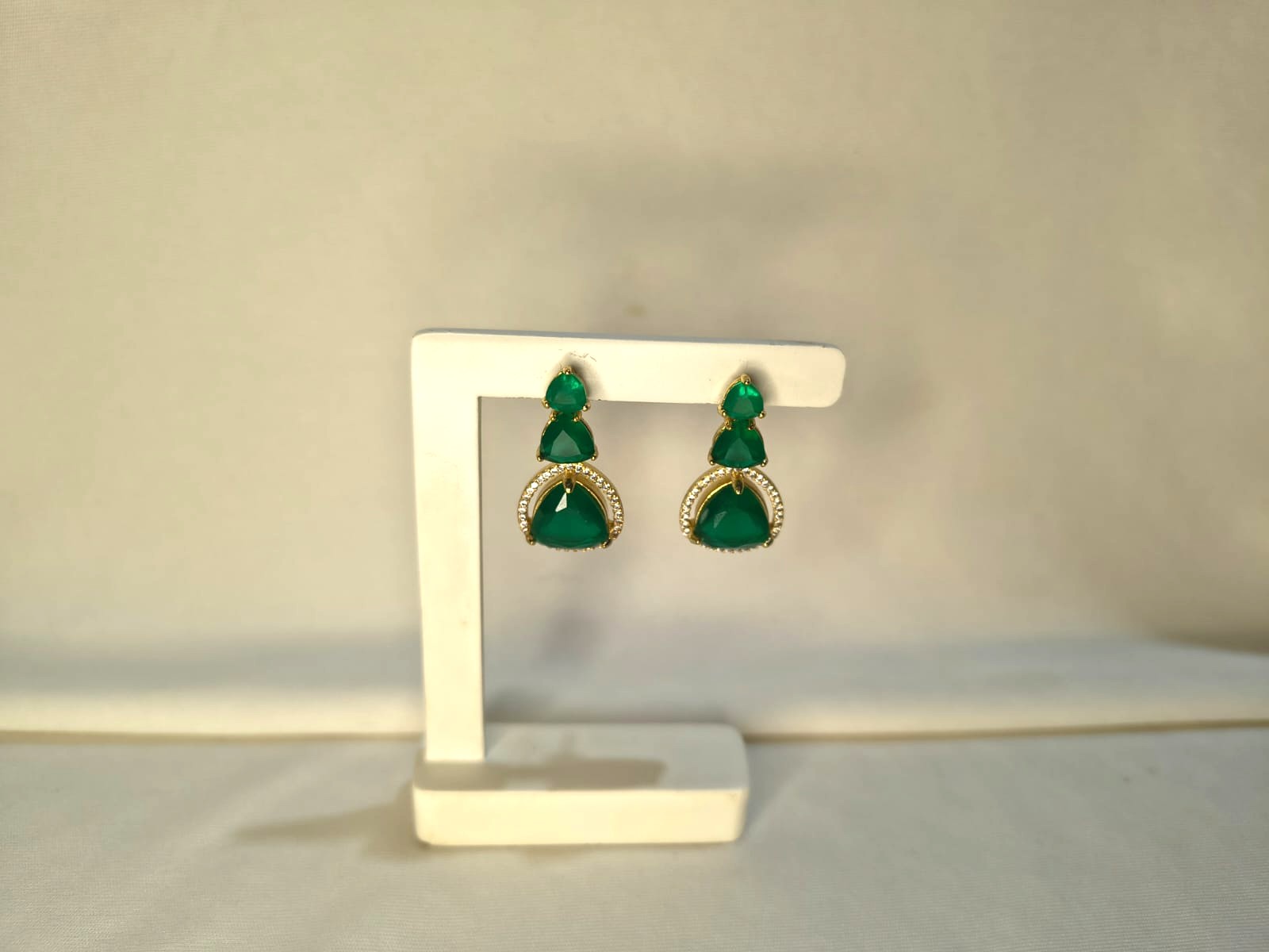 O brinco apresentado nesta imagem é um clássico modelo de festas, confeccionado no banho em ouro 18k com acabamento altamente polido e brilhante. Conferindo um visual elegante e moderno. O design em gota cravejado de pedras naturais esmeralda destaca a sofisticação da elegância, sendo ideal para complementar diversos estilos.