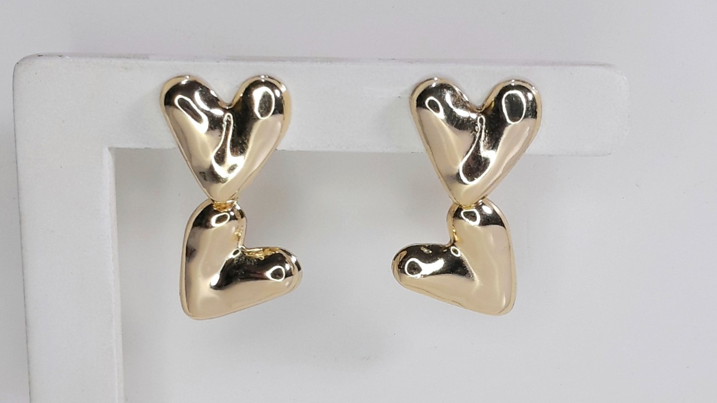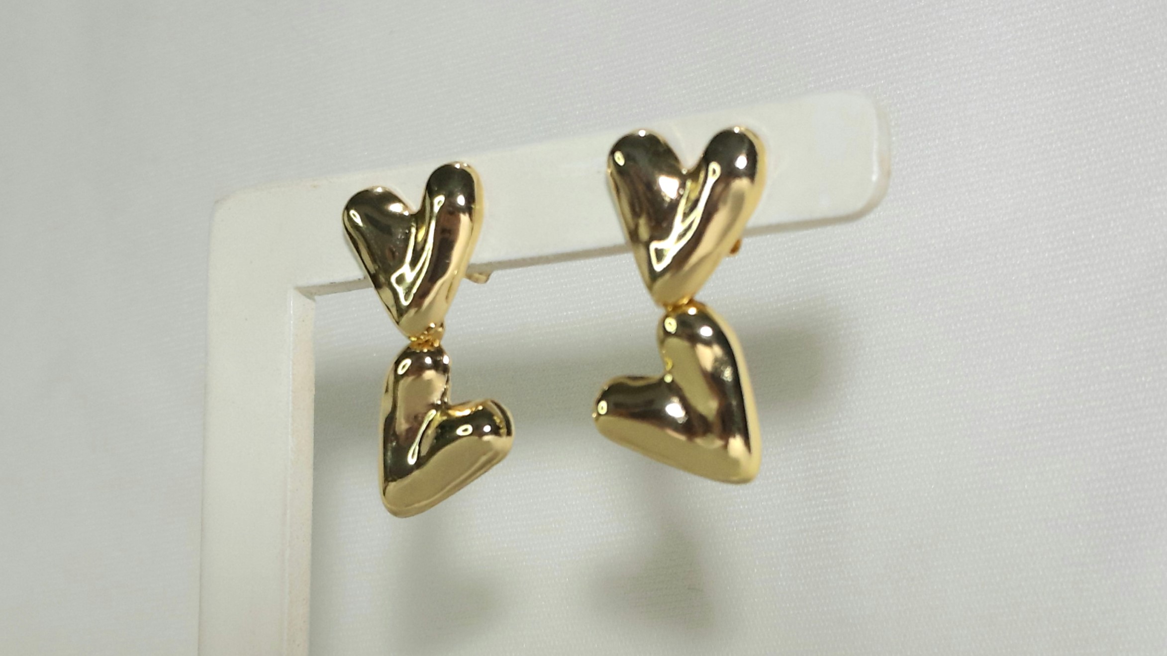 Brinco em formato de coração, banhado a ouro 18K, com um design sofisticado e elegante. A peça possui acabamento liso e polido, realçando o brilho do banho dourado, delicadamente requinte.