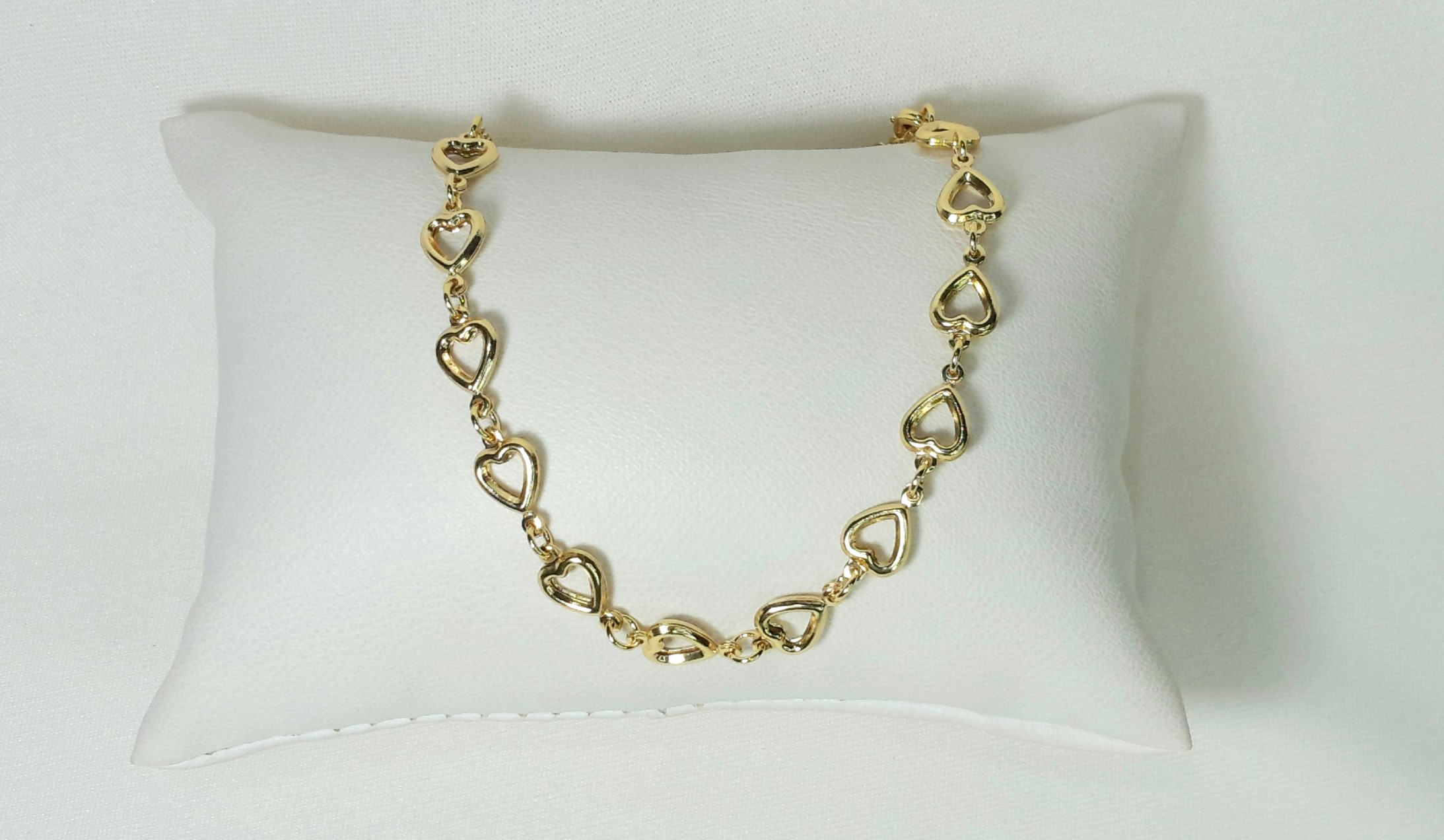 Uma gargantilha delicada e moderna, composta por uma corrente fina intercalada com pequenos pingentes em formato de coração vazado, distribuídos ao longo de toda a peça. Os corações, com seu design minimalista e leve, criam um visual elegante e sutil, adicionando um toque romântico sem excessos. O acabamento polido da corrente e dos pingentes reflete a luz suavemente, tornando uma gargantilha perfeita para complementar diferentes estilos, desde os mais casuais até os mais sofisticados.
