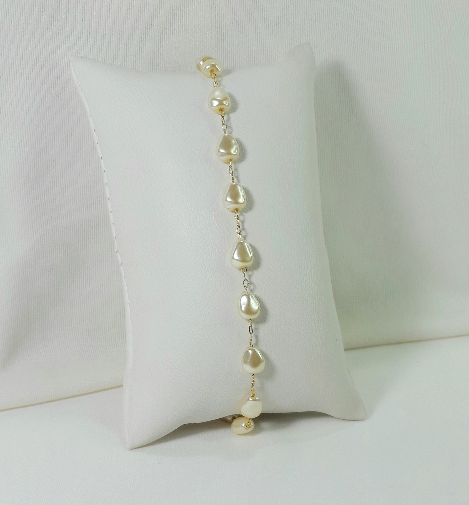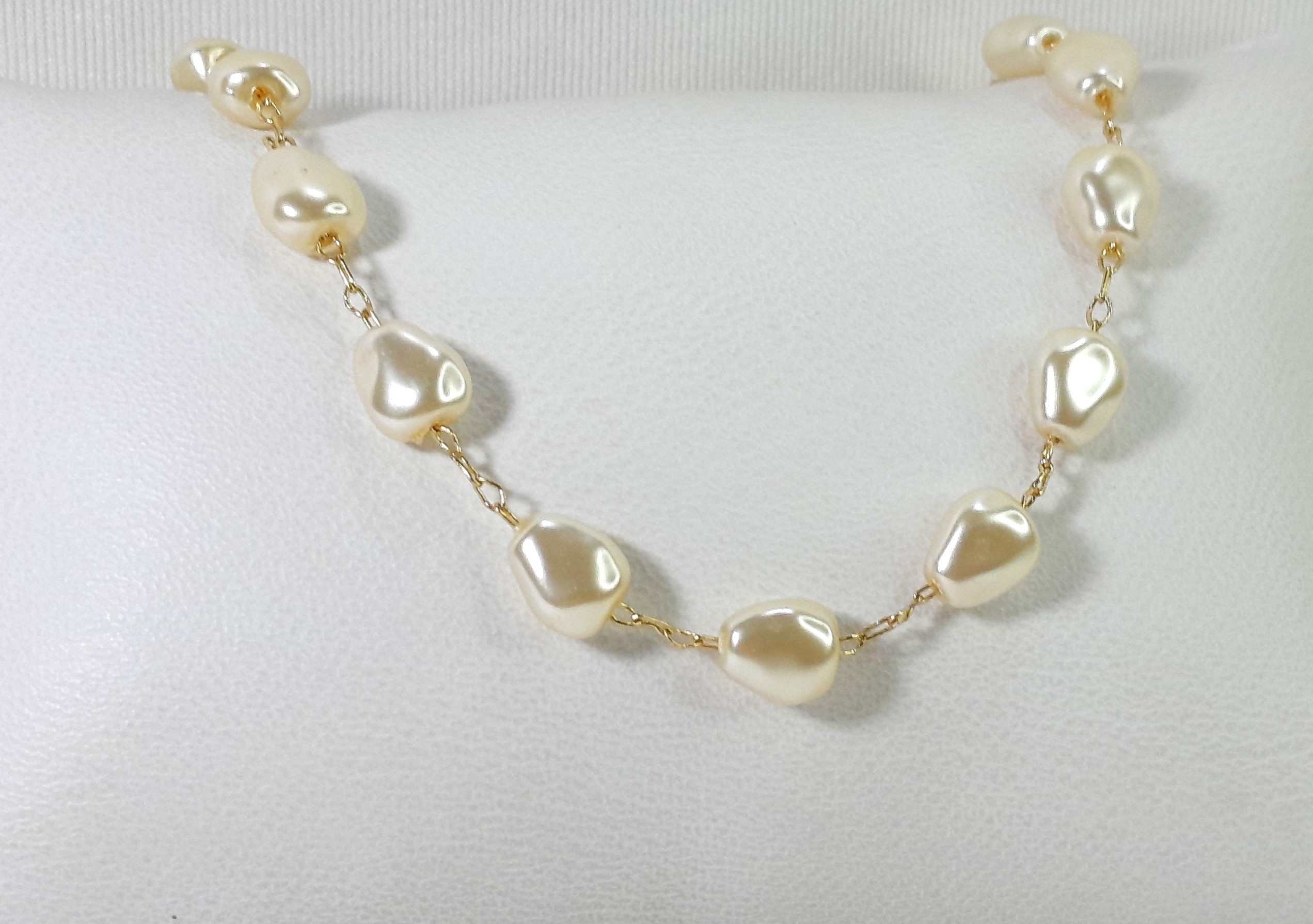 Um colar elegante composto por 24 pequenas pérolas de formas irregulares. As pérolas apresentam formatos orgânicos, como ovalados e oblongos, destacando suas imperfeições naturais. Elas estão dispostas em uma corrente fina e delicada, que complementa a estética única do colar. O design realça o brilho sutil e as formas distintas de cada pérola, ideal para quem busca um toque de sofisticação e autenticidade.