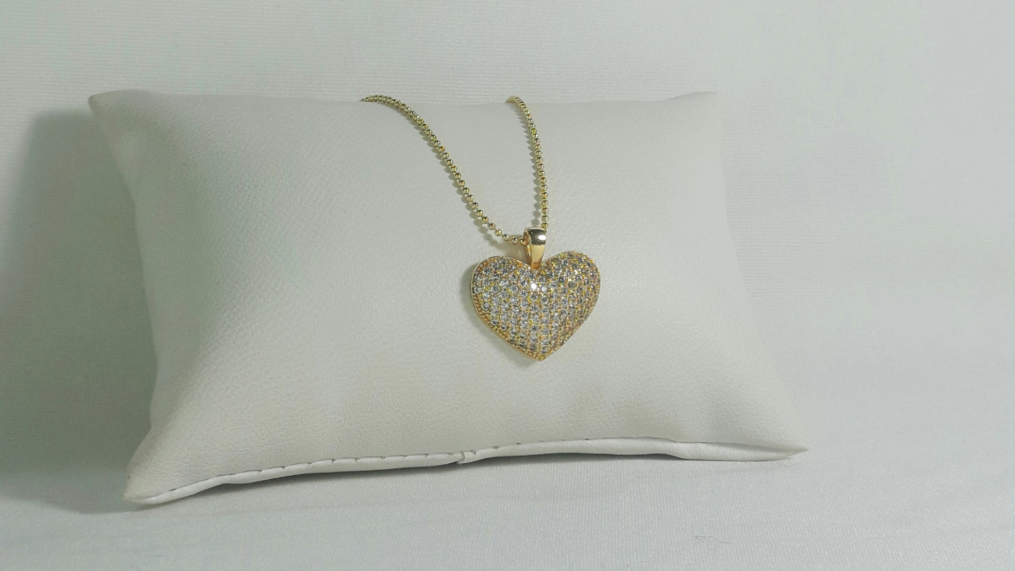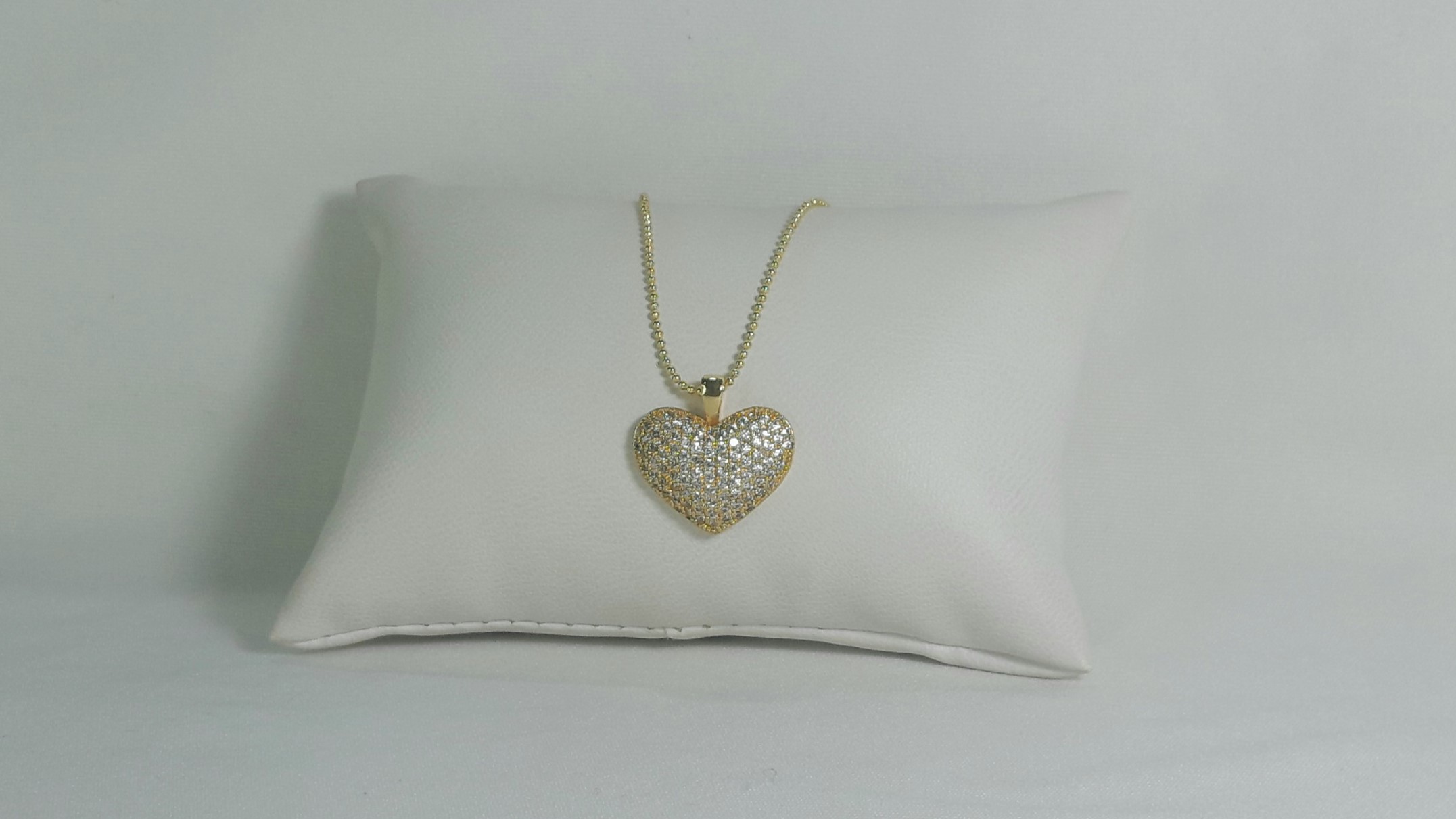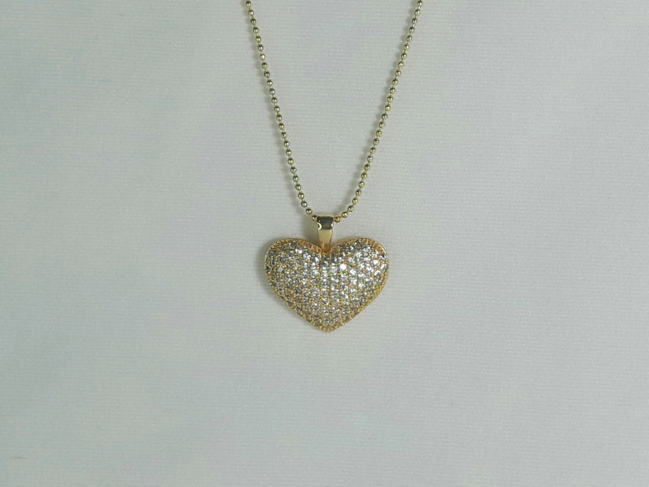 O colar apresentado nesta imagem é um modelo de coração cravejado, confeccionado no banho em ouro 18k com acabamento altamente polido e brilhante. Conferindo um visual gracioso e belo. O design da corrente com bolinhas e um pingente de coração cravejada realça beleza e delicadeza a uma mulher, trazendo muita feminilidade e graciosidade.