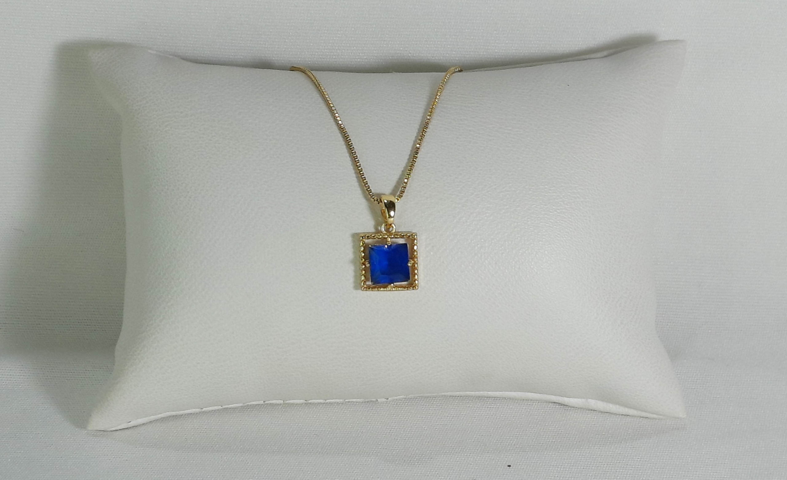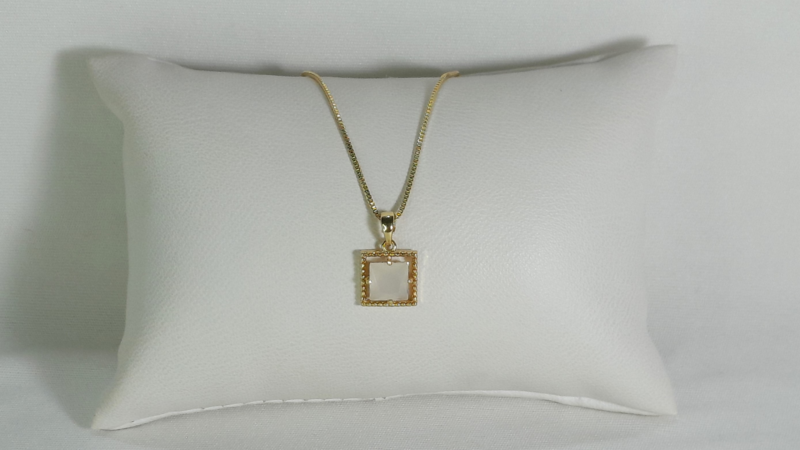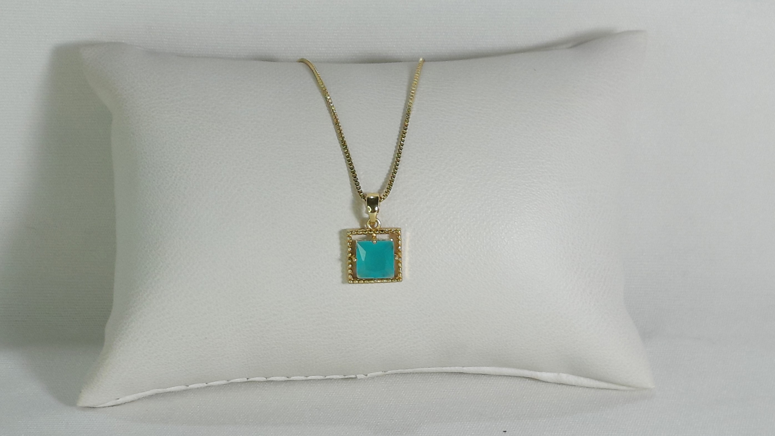 Este é um colar elegante com corrente dourada fina e um pingente em forma de quadrado. O destaque do pingente é a pedra central facetada, que neste modelo está em tom branco leitoso, com variações disponíveis em azul e ciano, criando um efeito translúcido e delicado. O quadrado é cercado por uma moldura dourada, complementando o brilho da corrente e realçando a pedra. É uma peça minimalista e sofisticada, perfeita para ocasiões formais ou para adicionar um toque de cor a um visual discreto.