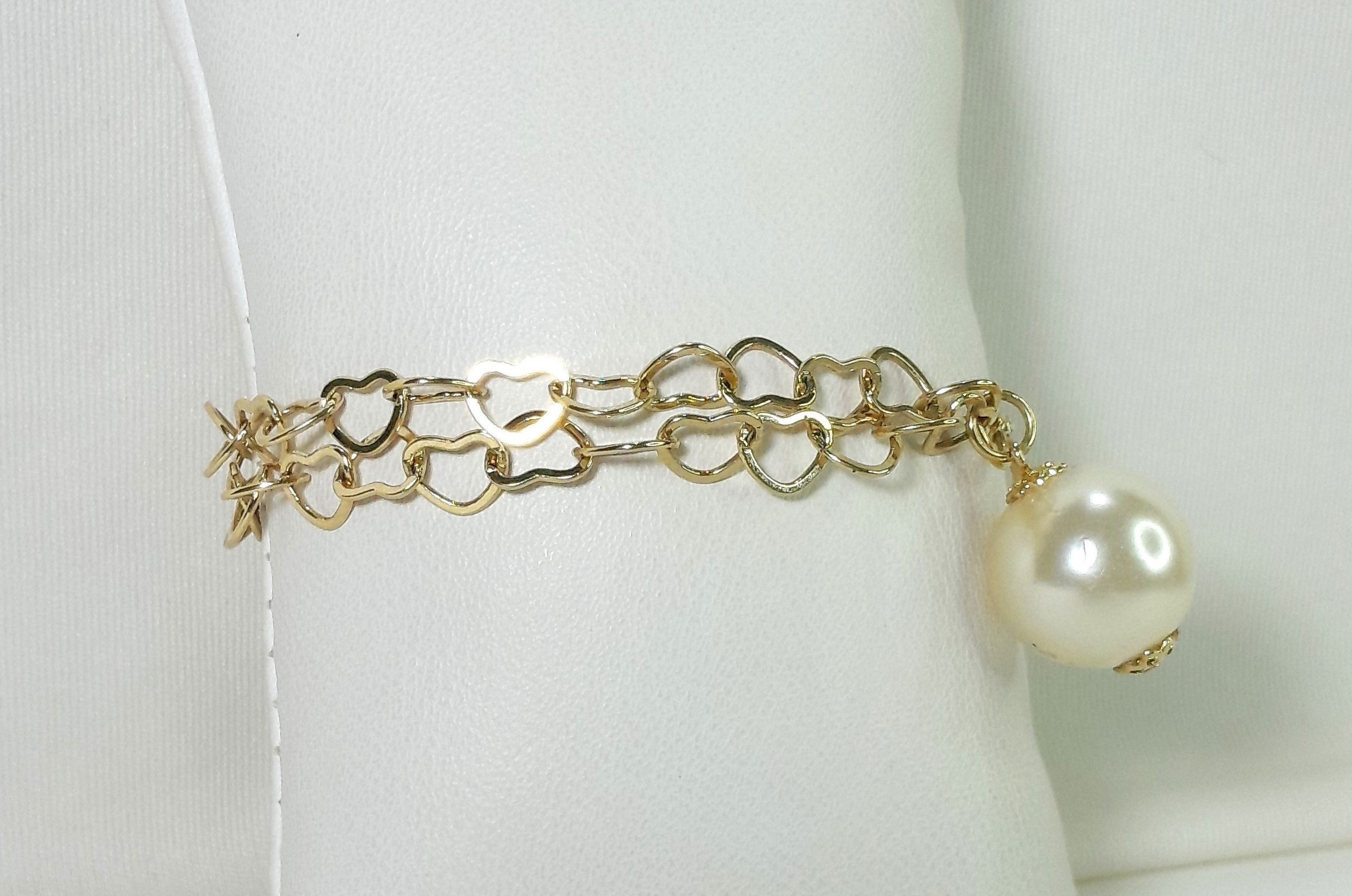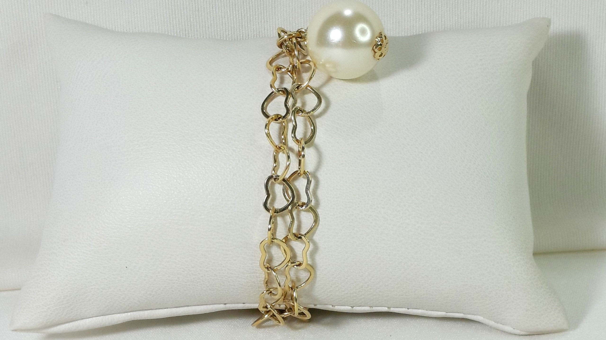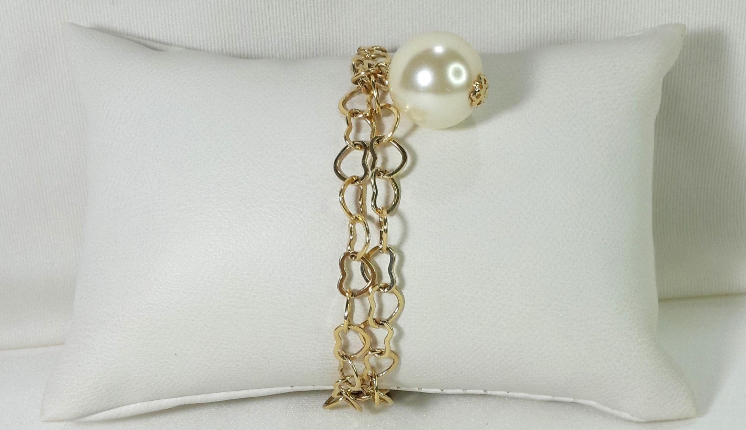 Esta pulseira apresenta um design moderno e elegante, com elos dourados em formato diferenciado, interligados para formar uma corrente visualmente impactante. Como destaque, há uma pérola grande e brilhante, adornada por um detalhe dourado decorativo em uma de suas extremidades, adicionando um toque sofisticado e luxuoso. Esta peça é ideal para compor looks contemporâneos com um toque de classe, perfeita tanto para eventos especiais quanto para destacar produções casuais com estilo.