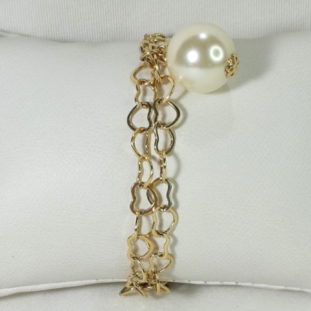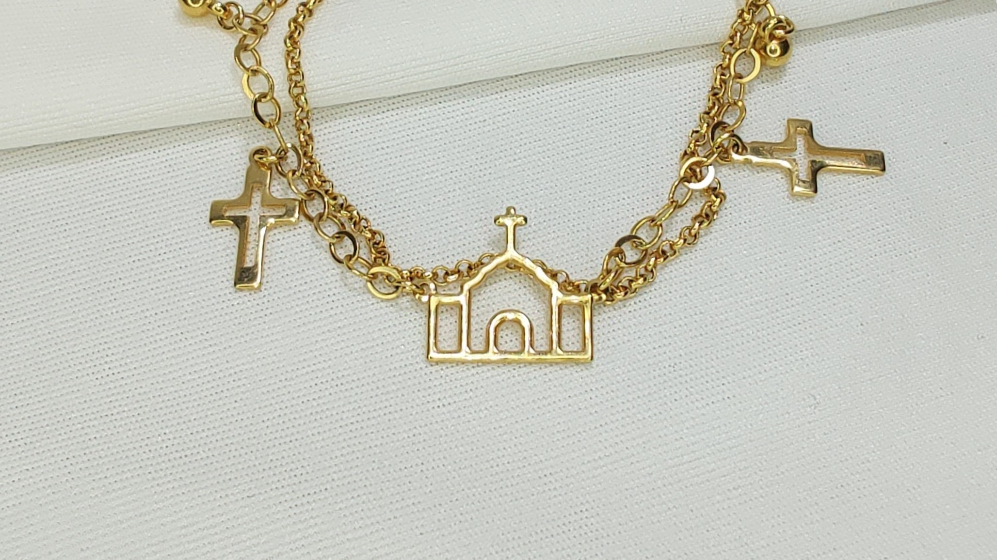 Esta pulseira possui um design religioso e delicado, confeccionada em metal dourado com elos finos. Ela é composta por duas correntes sobrepostas que dão uma sensação de volume ao acessório.