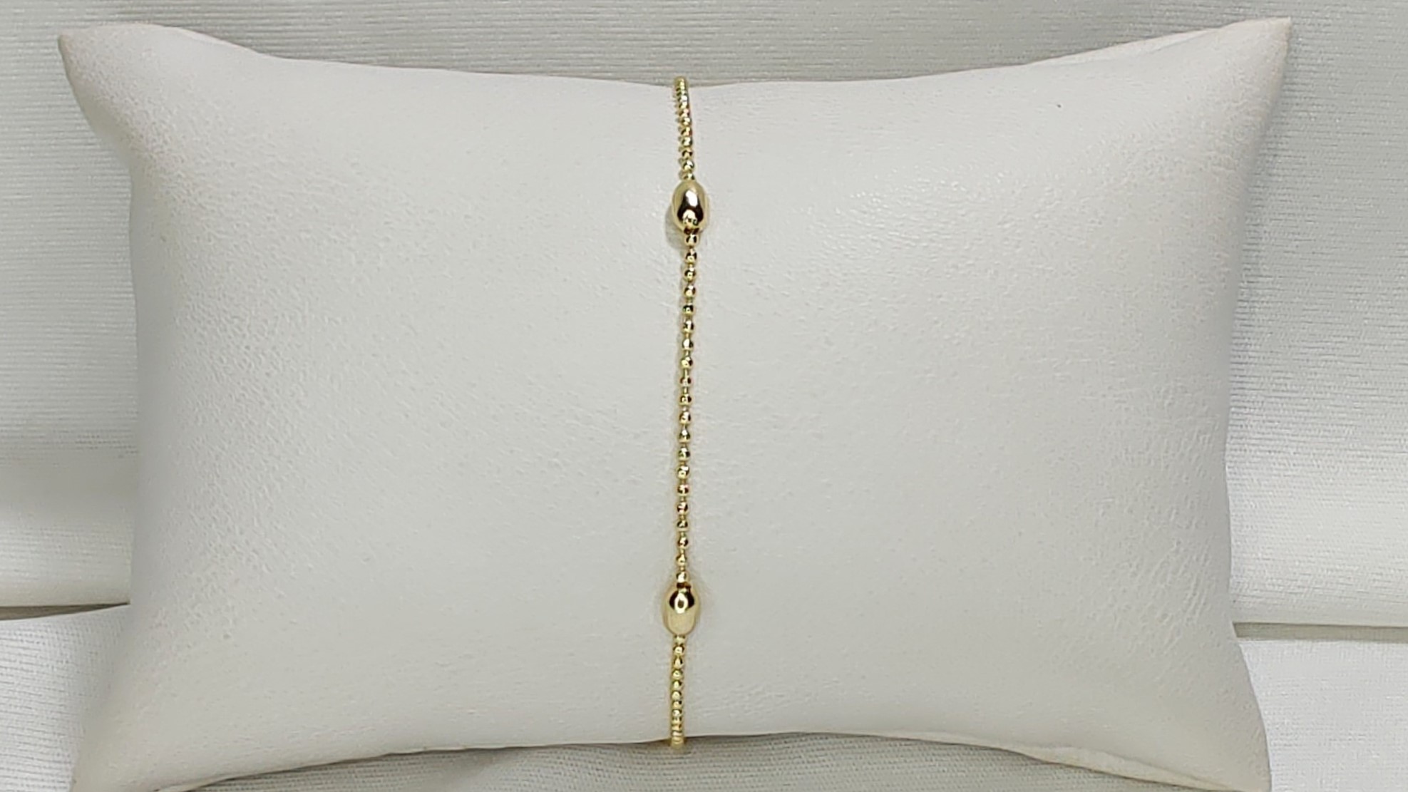 Esta pulseira encantadora apresenta uma corrente formada por delicadas bolinhas, que conferem leveza e um toque de sofisticação ao design. Como destaque, a peça possui quatro detalhes elegantes em formato que remete a grãos de arroz, simbolizando prosperidade e fertilidade em diversas culturas. O acabamento minimalista e refinado torna esta pulseira perfeita para compor tanto looks casuais quanto ocasiões especiais, oferecendo um equilíbrio sutil entre simplicidade e elegância.