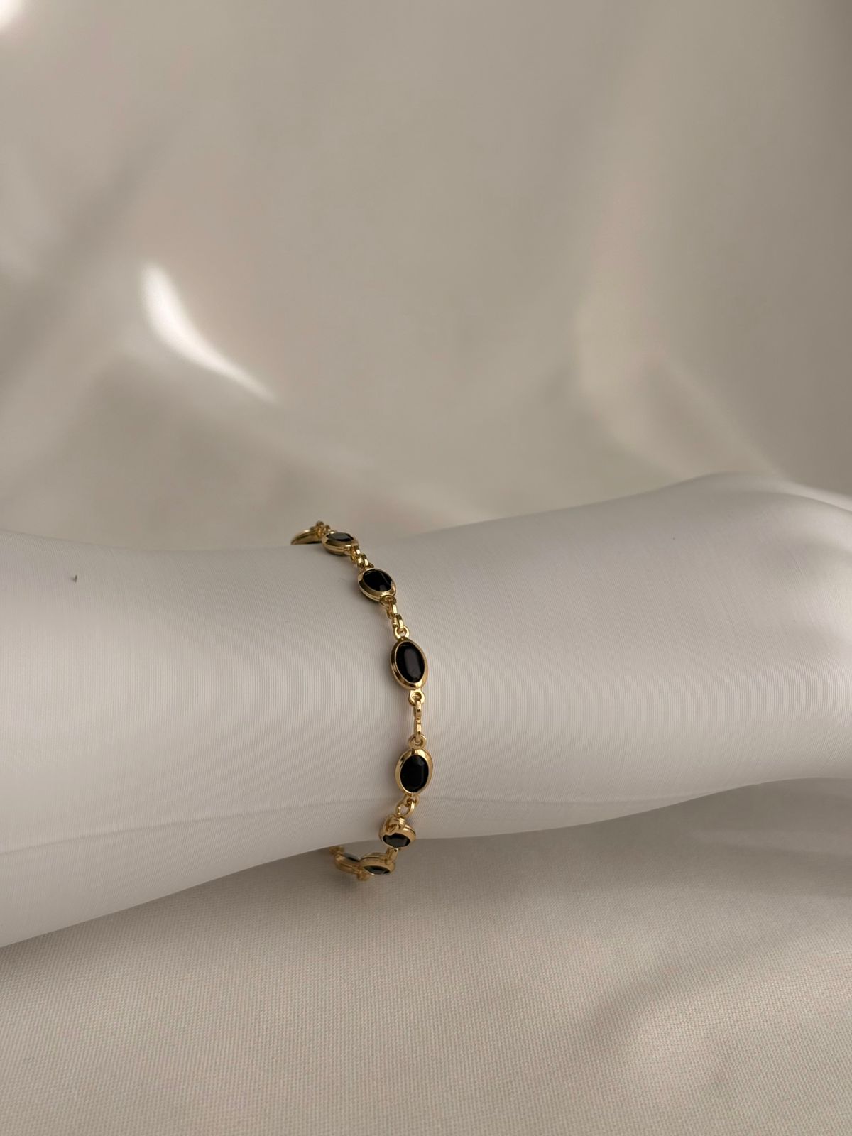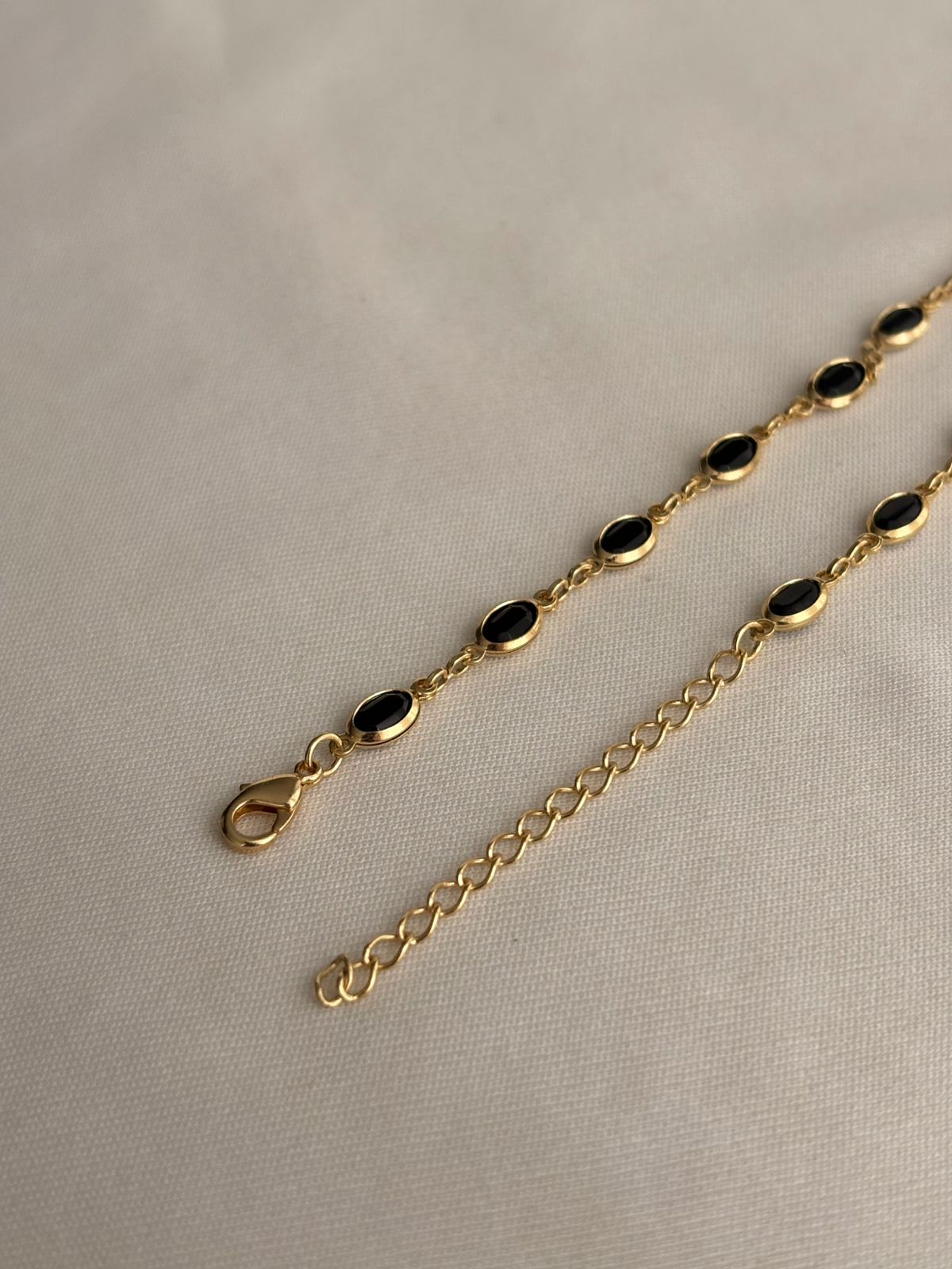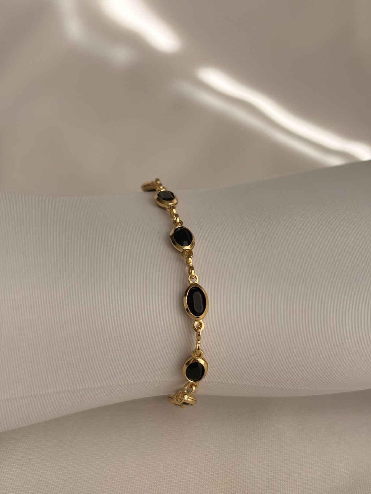 Pulseira em tons preto, banhada a ouro 18k, que combina contraste e sofisticação em um design marcante. Os detalhes em preto criam um visual contemporâneo e atemporal, enquanto o banho em ouro 18k acrescenta brilho e refinamento à peça. Versátil e cheia de personalidade, é perfeita para compor looks modernos ou adicionar um toque elegante ao dia a dia.
