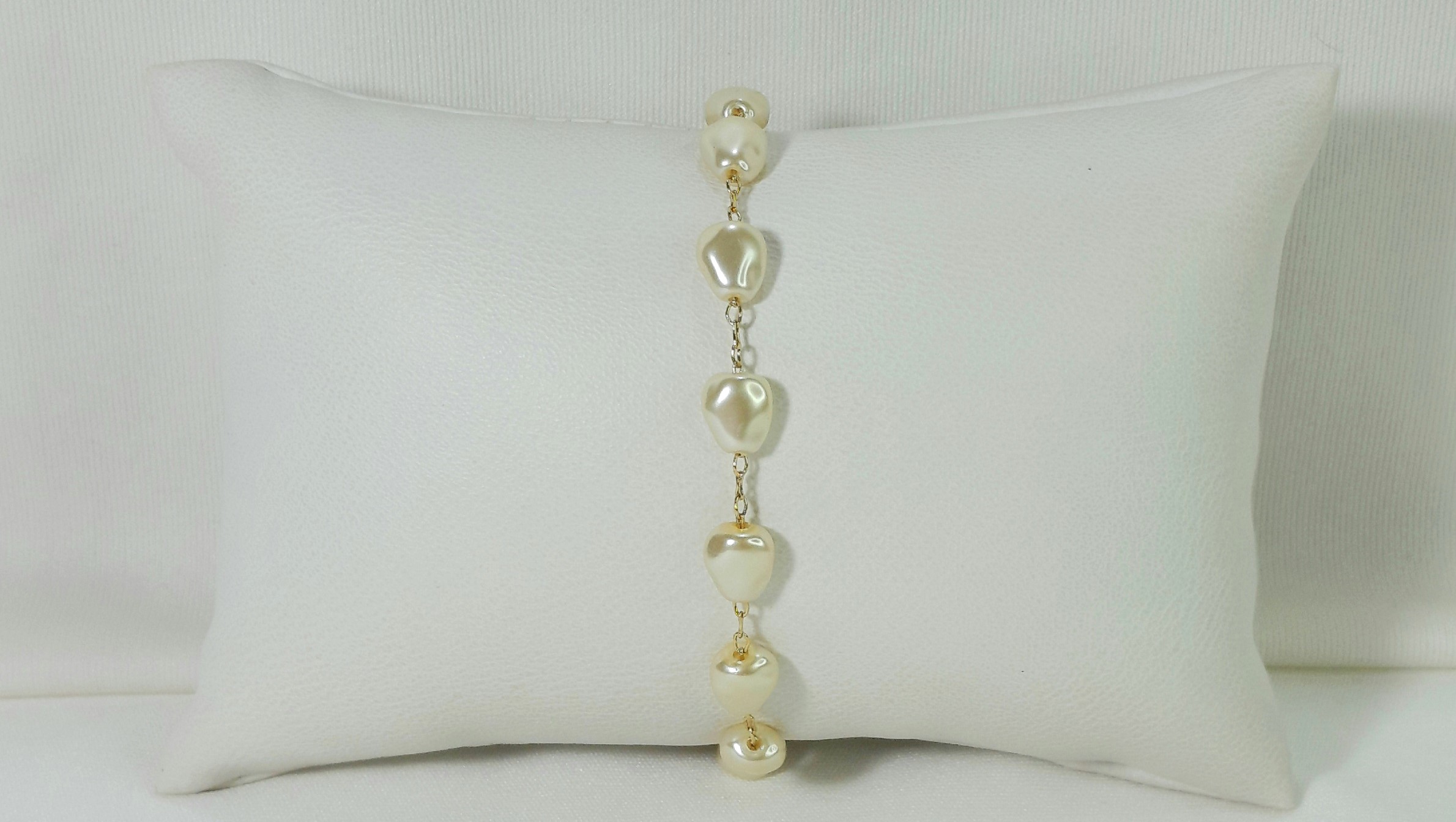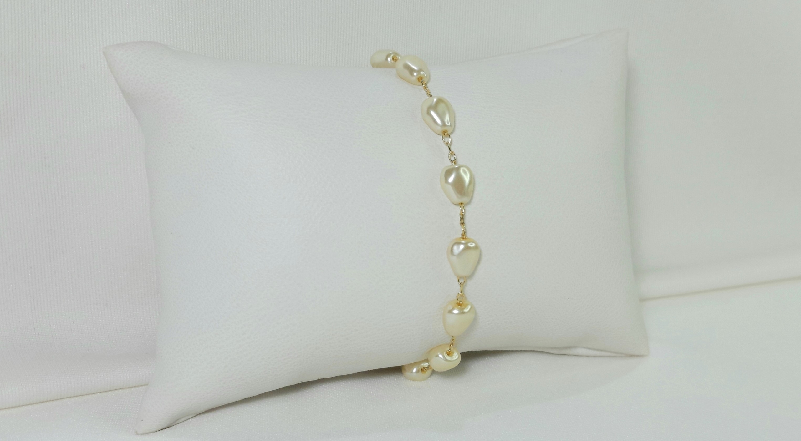 Esta pulseira é composta por 13 pérolas pequenas e irregulares, destacando sua aparência orgânica e natural. Cada pérola apresenta formas únicas, variando entre ovaladas e oblongas, o que reforça seu caráter artesanal e exclusivo. As pérolas estão delicadamente alinhadas em um fio fino e elegante banhado no ouro 18k, conferindo um equilíbrio entre sofisticação e simplicidade. A superfície das pérolas reflete uma luminosidade suave, com um brilho discreto que ressalta sua textura natural. O design é ideal para quem aprecia a beleza imperfeita e singular da natureza.