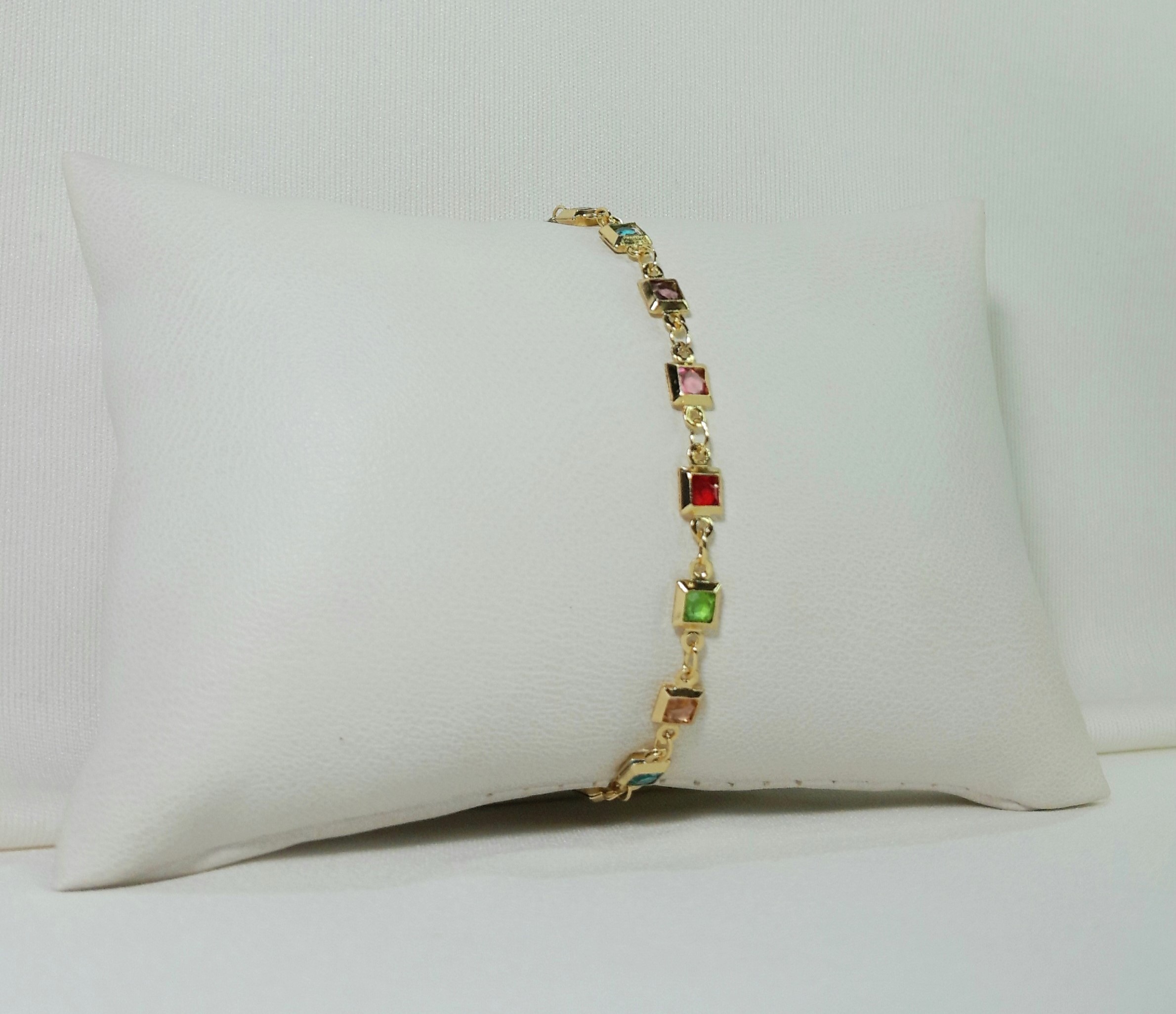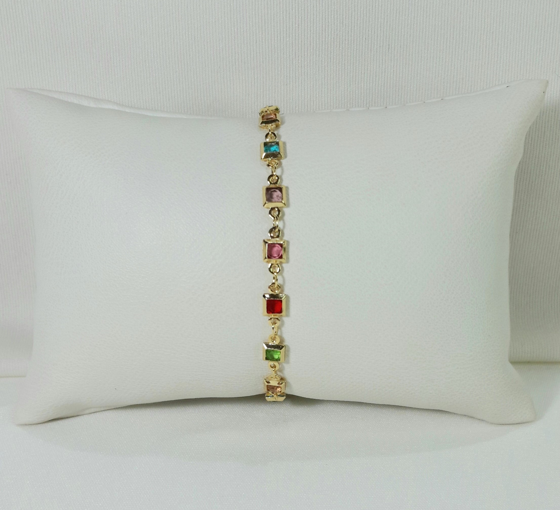 Uma pulseira fina e moderna, composta por uma sequência de pequenos quadrados coloridos dispostos lado a lado. Cada quadradinho é feito com materiais delicados, com uma paleta vibrante e harmoniosa que adiciona um toque de alegria e originalidade ao design. Os quadrados são ajustados de forma precisa, conectados por uma base metálica fina, no ouro 18k, criando um visual leve e sofisticado. Ideal para quem busca uma peça discreta, mas cheia de personalidade, essa pulseira é perfeita para complementar tanto looks casuais quanto produções mais elaboradas.