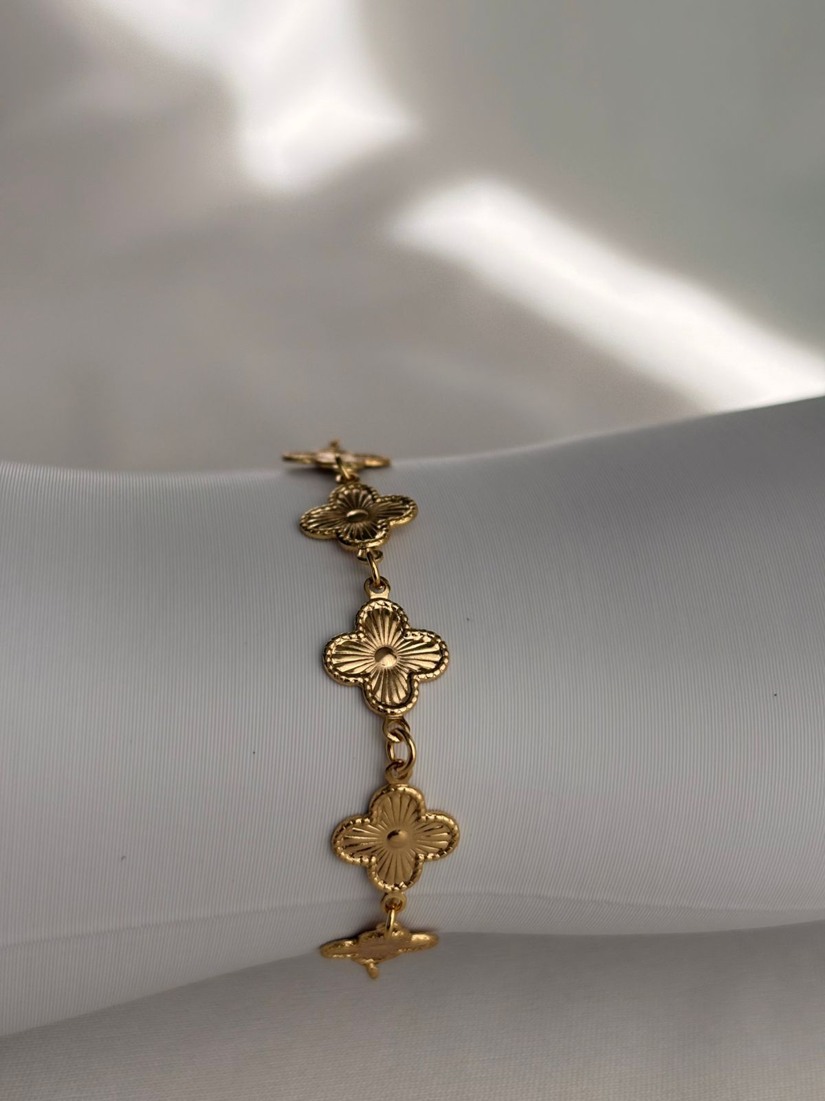A pulseira regulável com 5 trevos banhada a ouro é delicada, simbólica e cheia de charme. Os trevos, alinhados de forma harmoniosa, representam sorte, proteção e boas energias, trazendo um significado especial à peça. Com ajuste regulável, ela se adapta perfeitamente ao pulso, garantindo conforto e praticidade no dia a dia. O banho em ouro confere brilho elegante e acabamento sofisticado, tornando essa pulseira ideal para usar sozinha ou em composições modernas e femininas.