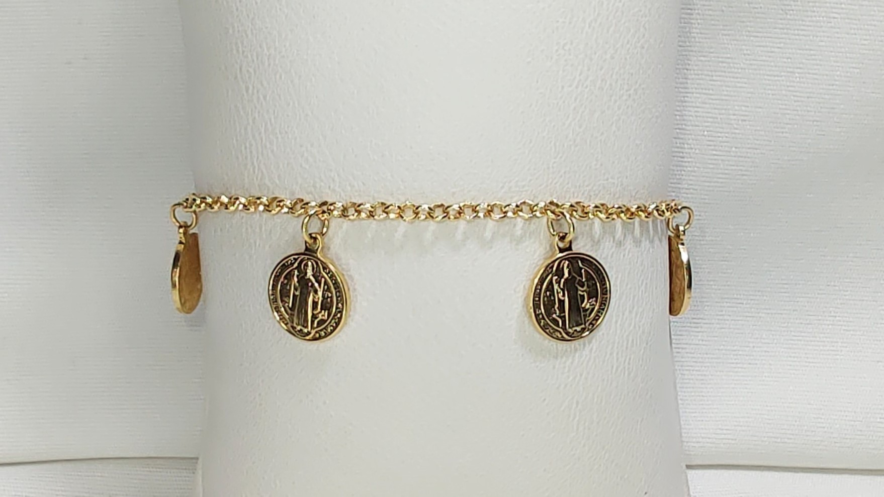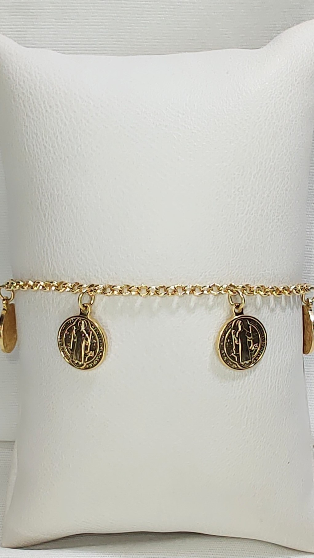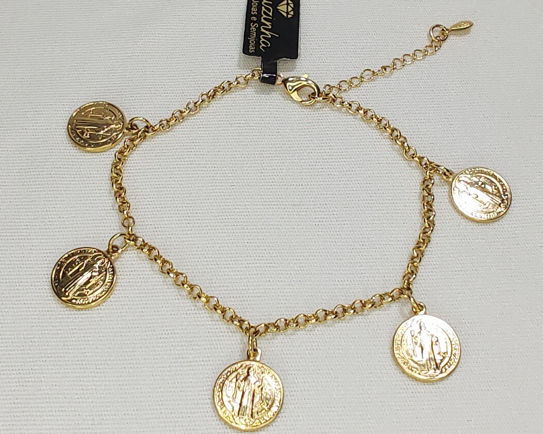 Esta pulseira dourada apresenta um design clássico e religioso, com uma corrente delicada de elos pequenos que confere leveza à peça. Como destaque, possui cinco medalhas de São Bento penduradas ao longo da corrente, todas com detalhes finamente trabalhados que retratam imagens sacras. A pulseira inclui um fecho ajustável com corrente de extensão, garantindo versatilidade para diferentes tamanhos de pulso. Uma escolha elegante e cheia de significado, ideal para expressar fé ou como presente especial.
